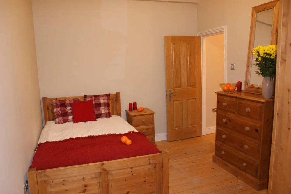 Large double room on middle floor furnished with double bed, wardrobe, chest, bedside cabinet, desk and chair.